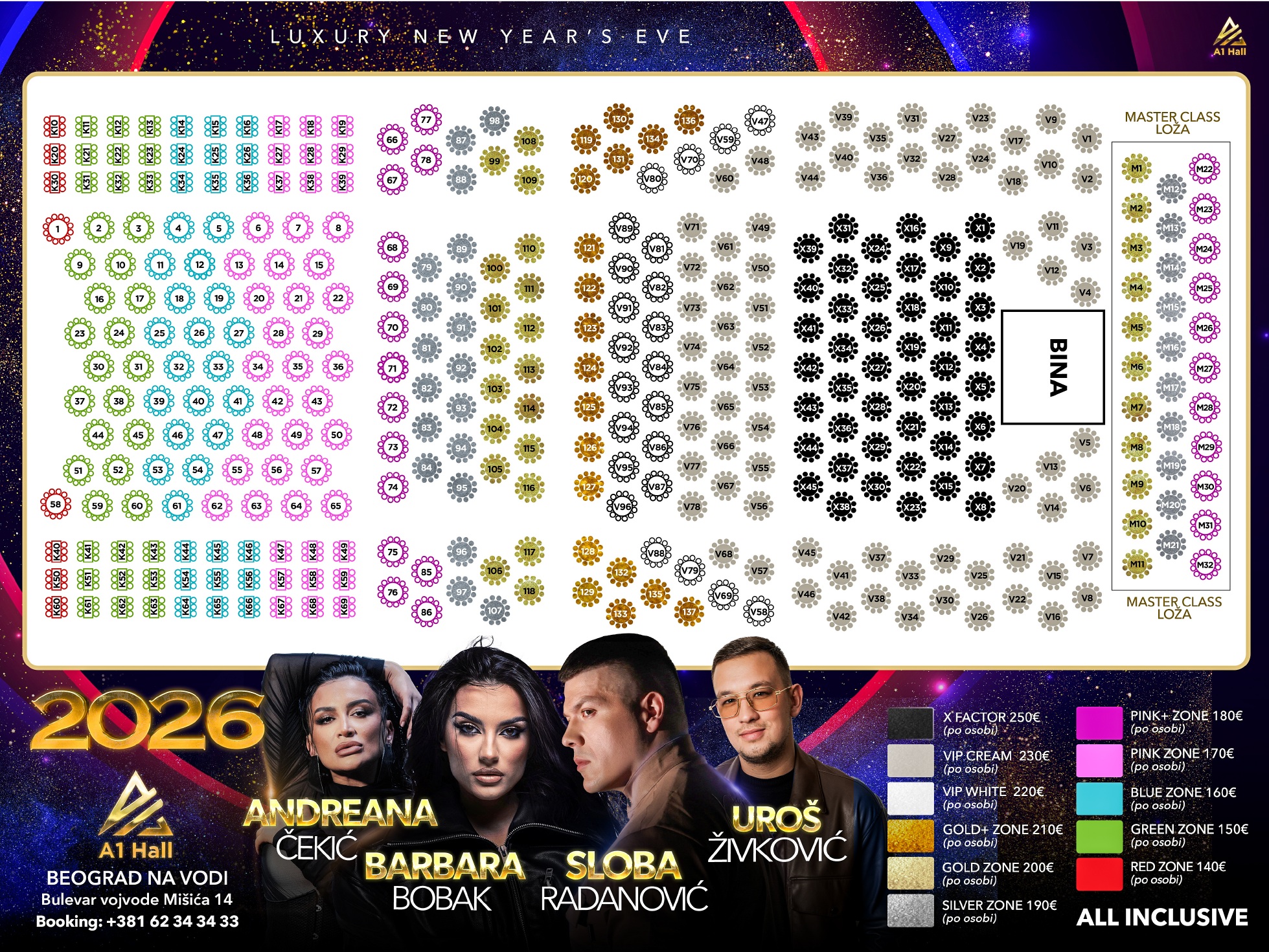 Cena po osobi je u zavisnosti od pozicije stola u samoj sali i uključuje elegantno mesto za sedenje, kompletnu bogatu večeru i neograničenu konzumaciju alkoholnih i bezalkoholnih pića tokom cele večeri (vidi na mapi, klikni na mapu za uvećan prikaz). Po želji uz kupljenu kartu za doček Nove godine u A1 Beograd na vodi je moguće ostvariti akcijsku cenu smeštaja u najkomfornijim hotelskim sobama vrhunskog luksuza u Beogradu, u okviru premium hotela Radisson Collection koji se nalazi preko puta, na bazi noćenja sa doručkom i sa neograničenim korišćenjem spa centra (đakuzi, sauna, parno kupatilo) i fitness centra za sve vreme boravka u hotelu. Sobe su površine između 33 i 44 kvadratnih metara sa neograničenim korišćenjem interneta i velikim brojem sadržaja (aparat za espresso kafu, fen za kosu, daska za peglanje i pegla, papuče i bade mantili, mini bar). Pritom su akcijske cene za goste koji idu na doček Nove godine 2026 u A1 Beograd na vodi izuzetno primamljive i pristupačne. Postoji i mogućnost iznajmljivanja hotelskog parking mesta, kako na ograđenom spoljnjem parkingu sa rampom i video nadzorom, tako i u podzemnoj garaži hotela. Takođe, smeštaj po povlašćenim cenama (dosta nižim od redovnih cena i cena preko booking-a) za goste ovog dočeka je moguć i u još dva hotela u Beogradu na vodi! Za detaljne informacije obratite se call centru beogradnocu. Smeštaj nije obavezan, već je na raspolaganju samo kao dodatna opcija ko želi. Može i samo doček.